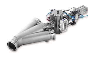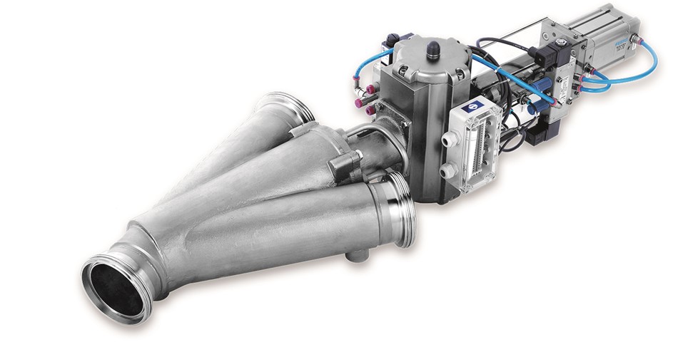 The patent-pending design of the WYK-CIP Diverter Valve incorporates an innovative retractable rotor assembly and is completely designed in accordance with European Hygienic Engineering and Design Group (EHEDG) guidelines. The valve has a true sanitary and wet cleanable design that permits the automatic cleaning of pneumatic conveying pipes. The WYK Two-Way Diverter Valve is ideally suited for inline material handling of hygienic and difficult to handle powders, such as whey powder, lactose, dried milk powders and infant formula. This valve can be used in pneumatic conveying systems, in order to divert transfer of the powder to different locations, and it is often used in return lines in spray drying applications. The fully automatic CIP (Clean-in-Place) design permits complete purging of all product residues after the automatic cleaning process without dismantling and without manual cleaning. Due to a retractable rotor assembly, the rotor can be pulled slightly out of the housing towards the rear of the valve, thus allowing the cleaning solution to rinse all product contact surfaces within the valve. In addition, specialty purge openings in the actuator plate enable an intense rinsing flow and complete discharge of the rinsing effluent. The CIP design is particularly advantageous for locations which are typically difficult to access. By significantly reducing the downtime for cleaning, the CIP concept saves both time and money. Coperion is the international specialist in compounding and extrusion systems, feeding and weighing technology, bulk materials handling systems and services.